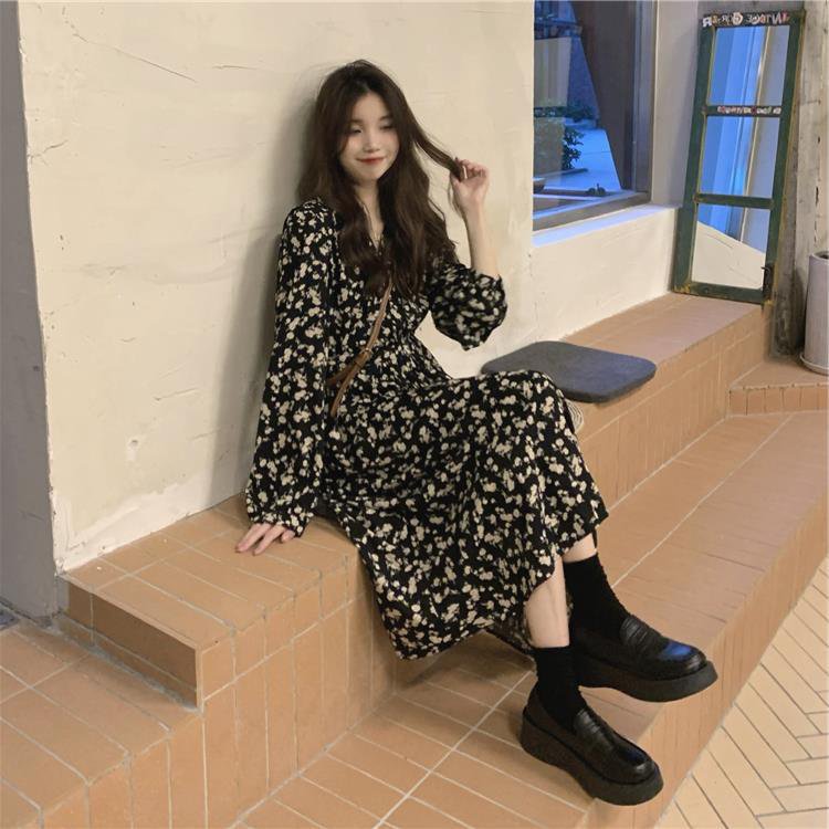 Vネック花柄ロングワンピース